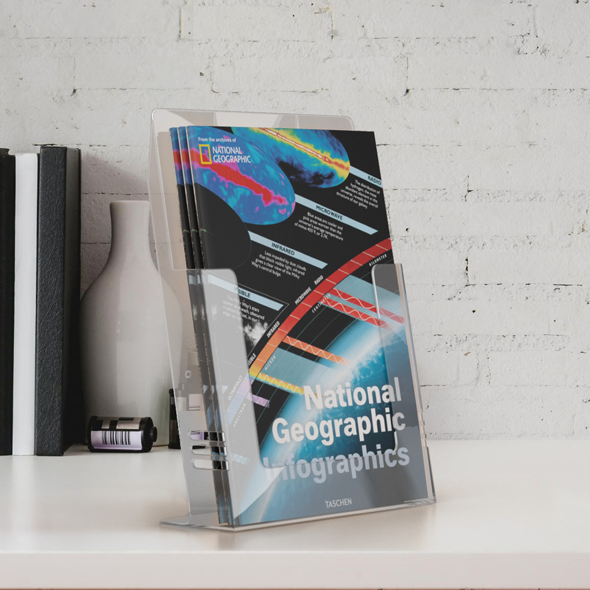 Универсальный держатель буклетов. Может располагаться на столе или крепится к стене. Изготовлен методом литья под давлением.