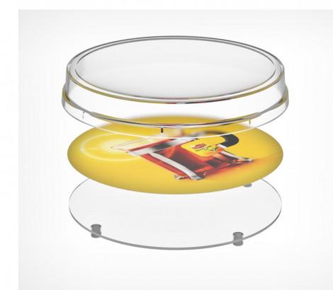 Круглая монетница RONDA — раскладная конструкция из основания и крышки, которые легко совмещаются и закрываются на защёлкивающийся замок. Некоторые характеристики: материал — пластик размер — 172×24 мм диаметр рекламного поля — 166 мм цвет — прозрачный 4 прорезиненные ножки для установки на любой поверхности используется для организации расчёта с покупателями и в качестве рекламоносителя. Производитель: Россия.