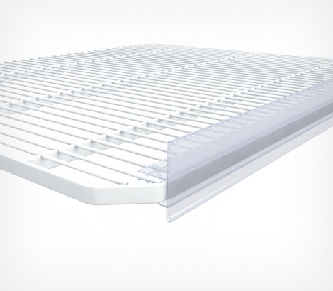 Ценникодержатель для полок с торцом из двух прутов. Чаще всего применяется в вертикальном холодильном оборудовании. Имеет смещенный в нижнюю часть профиля фиксатор для сокращения занимаемого пространства выкладки уровнем ниже и более легкого вынимания товара. Верхняя часть профиля выступает ограничителем для товара.