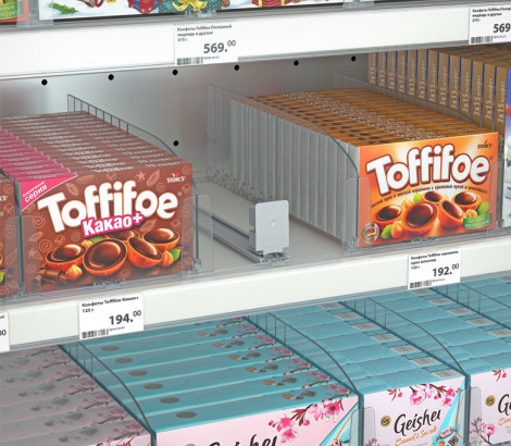 Толкатель FORTA NORMA-0 — используется в магазинах и супермаркетах для презентации товаров в небольшой упаковке, например, сигаретных пачек или лекарств, изготовлен из прочного пластика, фиксирует последнюю упаковку у края полки. Рекомендуется использовать с разделителями, имеющими передний ограничитель