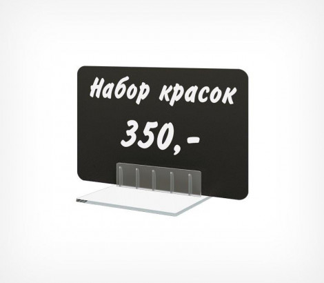 Держатель - подставка для ценника, таблички.  Позволяет размещать ценники и таблички для надписи маркером,  под углом 75° и 90°  к поверхности размещения. Фиксирует вставки толщиной до 0,8 мм.  Противоскользящие ножки.