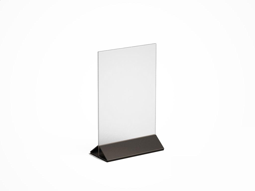 МЕНЮХОЛДЕР ФОРМАТА А-5, С НИЖНЕЙ ЧАСТЬЮ РАЗЛИЧНЫХ ЦВЕТОВ, КЛАСИЧЕСКОГО ВИДА. СОСТОИТ ИЗ ДВУХ ЧАСТЕЙ, ПРОЗРАЧНОГО ПЛАНШЕТА ИЗ ОРГСТЕКЛА И НИЖНЕГО ДЕРЖАТЕЛЯ, ТРЕУГОЛЬНОЙ ФОРМЫ ИЗ ЦВЕТНОГО ПОЛИСТИРОЛА.