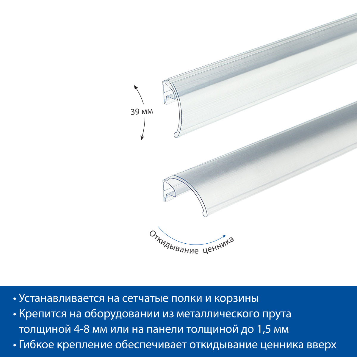 Ценникодержатель на корзины из метал. прутьев KEC-39 дл.1000 мм прозрачный - усовершенствованная модель ценникодержателя на сетчатые полки и корзины для лучшей фиксации на оборудовании из металлического прута толщиной 4-8 мм и крепления на панели толщиной до 1,5 мм.