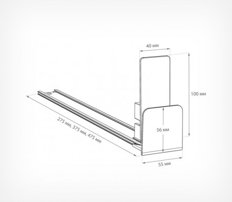 Данная модель пружинного толкателя имеет прямо стоящую толкающую поверхность размером 40х100 мм, а также передний ограничитель размером 55х56 мм.