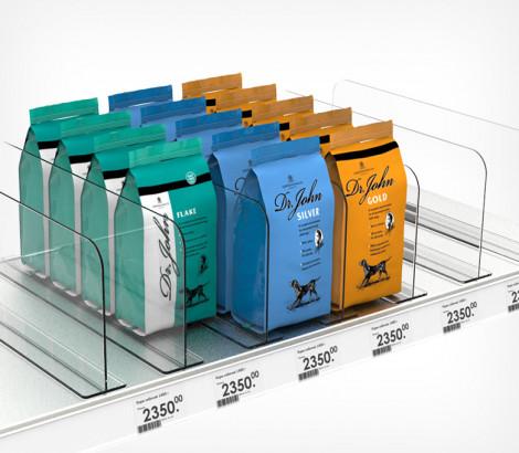 Пластиковая задняя опора используется индивидуально или в комплекте с ребристым профилем BACKLINE. Ребристые выступы в нижней части опоры удерживают плоские упаковки товара, обеспечивая его идеальную подачу покупателю.