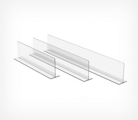 Разделитель DIVТ-80 Т-обр. высота 80 мм — универсальный разделитель товаров для организации выкладки на стеклянных, деревянных или металлических полках магазинных стеллажей. Подходит для полок глубиной 300 мм; подходит для использования с большинством товаров из ассортимента супермаркетов, аптек, магазинов формата дрогери, косметики и канцелярии;не требует дополнительных крепежных аксессуаров для установки; ширина основания — 45 мм; цвет — прозрачный.