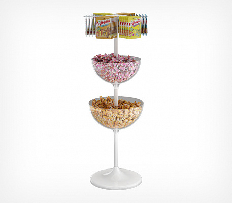 Дисплей UNIBOWL-17-24-HP-6 — это компактный дисплей с двумя чашами объёмом 17 и 24 литра и платформой с крючками. Подходит для демонстрации и продажи мелких продовольственных и непродовольственных товаров как в упаковке, так и в пакетиках с еврослот. Дисплей состоит из нескольких частей, которые легко собираются между собой без использования инструмента: пластиковое основание, труба длиной 410 мм, две трубы длиной 520 мм, пластиковые прозрачные чаши объёмом 17 и 24 литра, пластиковый держатель с 6 металлическими крючками, заглушка, защищающая полость трубы. Может использоваться с дополнительными опциями: информационной рамкой, ценниками, разделителями внутреннего пространства чаш, которые приобретаются отдельно