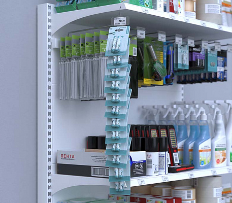 12 пластиковых крючков-фиксаторов расположенных с шагом 47 мм обеспечивают надежное и удобное размещение товаров на ленте. Верхняя часть ленты оснащена топпером для крепления ценников или рекламных наклеек. Дополнительно, в верхней части ленты предусмотрено отверстие для крепления с использованием специального металлического крючка для страйп-лент или хомута.